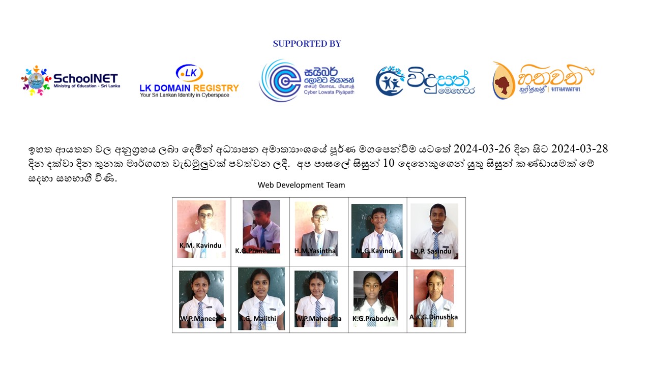 පහත සදහන් ආයතනයන් වල අනුග්‍රහය ලබාදෙමින් අධ්‍යාපන අමාත්‍යාංශයේ පූර්ණ මග පෙන්වීම යටතේ 2024-03-26 දින සිට 2024-03-28 දින දක්වා දින තුනක මාර්ගත වැඩමුළුවක් පැ පවත්වන ලදී. අප  පාසලේ සිසුන් දහ දෙනෙකුගේ යුත් කණ්ඩායමක් මේ සඳහා සහභාගී විණි.